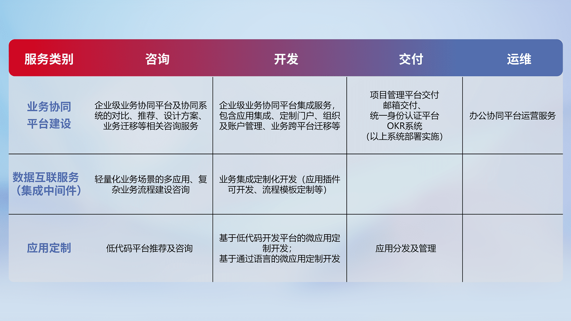 针对钉钉、、、、企微、、、、IDaas等平台级产品提供产品的规划、、、、方案、、、交付、、、、定制化开发等服务,,,,实现如统一协同办公、、、智能客户服务、、、、混合会议管理、、、智能数据查询、、、等业务场景,,实现数字化转型。。